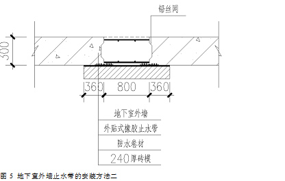 方法二:地下室外墻需安裝止水帶的部位,在止水帶背面砌筑240mm 厚磚墻作為外模,磚墻的寬度和長度應滿足止水帶安裝的要求,磚墻應與地下室外墻整體模板(鋼模、竹模等)連接成一體,以防澆筑混凝土時漏漿,失去止水作用。磚墻內側提前粘貼3mm 厚的三元乙丙橡膠防水卷材或氯丁橡膠片(粘貼于磚墻內側抹灰層之上,要牢固),然后再將橡膠止水帶與其用401 防水膠粘貼牢固。如圖5 所示。